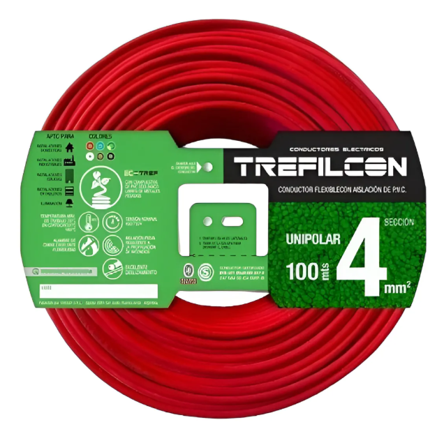 El cable unipolar Trefilcon 4 mm² es un conductor eléctrico de alta calidad, diseñado para instalaciones que requieren un solo conductor, tanto en interiores como en canalizaciones protegidas. Su construcción con cobre y aislamiento de PVC garantiza seguridad, durabilidad y eficiencia en la conducción eléctrica.